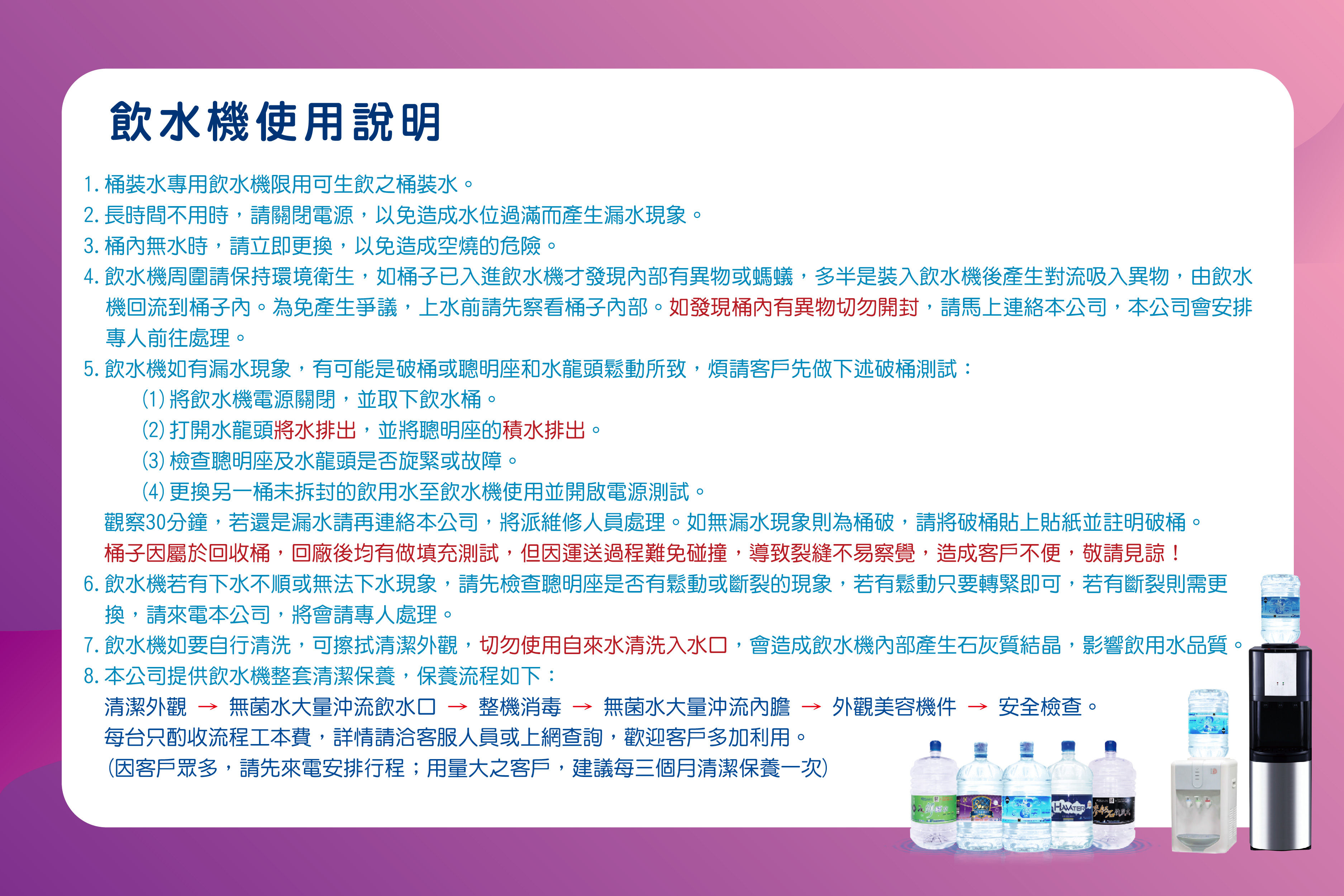 §飲用水桶押桶費說明 桶裝飲用水自生產後保存期限為三個月,於瓶蓋有明確標示,請消費者於期限內盡速用完。飲用水桶為回收式,超過保存期可能會有影響水質及細菌增加機會,若已飲用完畢的水桶置放一段時間後,更容易因環境、光線、潮溼等外在因素滋生更多問題。為保障下一位使用者的安全及權益,我們有責任對於售出的產品做最嚴格的把關,不回收逾期飲用水桶。 消費者於購買本公司桶裝飲用水時,於官網、訂購單、新客戶桶裝水使用說明中都有明確告知:為保持飲用水安全,桶裝水有效飲用期限為90天,瓶蓋上有標註保存期限,過期請勿使用。 飲用水桶需於180天內回廠交換消毒,逾期將轉為客戶買斷,不再交換使用,水桶歸屬客戶所有。飲用水桶每支售價200元。 飲用水桶回收會經由本公司水廠自動化設備消毒,但不可測知的外在因素很多,尤其是逾期水桶,本公司將直接銷毀不再使用。本公司非常重視消費者的飲水安全,若對此標準不認同或不願配合的消費者,本廠也將無法繼續服務,安全負責任的產品是需要和您共同努力的。 §桶裝飲用水的先進與安全 鮮喝水製造廠在製水技術及服務不斷領先業界,是全國第一家也是唯一一家桶裝飲用水有e化產品履歷的水廠,每一桶水都可追朔歷程,每一桶水的水質都經得起檢驗,本廠e化製程能多帶給消費者品質上的安全與保障。 若您要便宜的桶裝水或不管合格性的飲用水,本公司並無此類產品,若您要飲用安全有保障的桶裝水,在新竹,鮮喝水製造廠的產品就是您唯一的選擇。四種水別可針對不同需求的消費者提供更實際的飲用選擇。您的每一桶水的消費均是真實的產品呈現給您。 本廠沒有華麗不實的網站與廣告,但累積了新竹地區最多人使用的桶裝飲用水,本公司不斷的希望消費者能親臨水廠參觀~眼見為憑~參觀過,您就會一切明白與了解什麼是合格有規模的桶裝水製造廠。 §桶裝水宅配費用說明 本公司產品隨時提供外送優惠價格,每次宅配5桶以上免宅配費,未達5桶會另收取宅配費用,請消費者知悉。